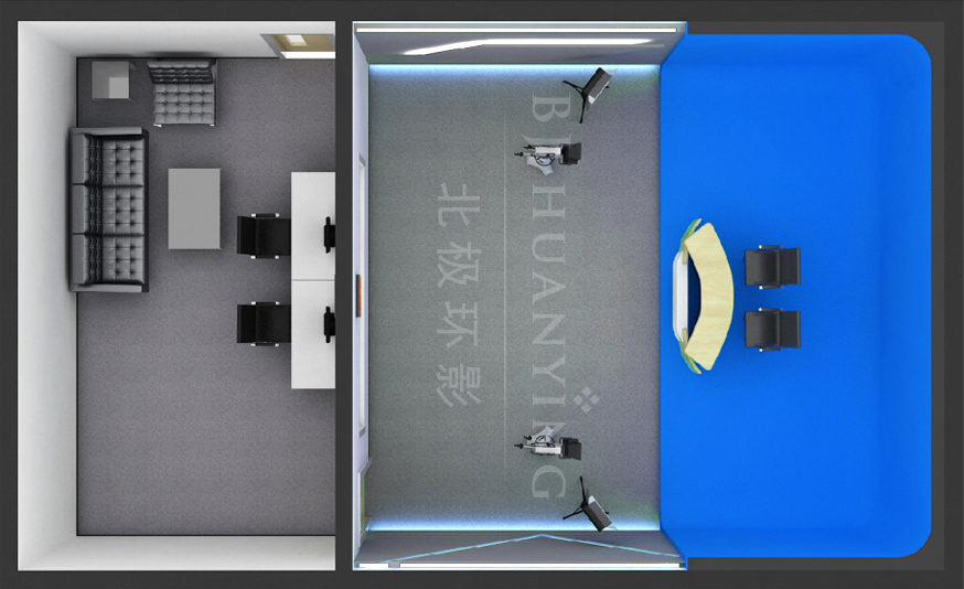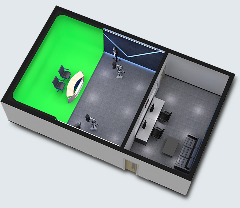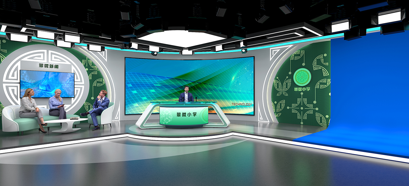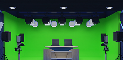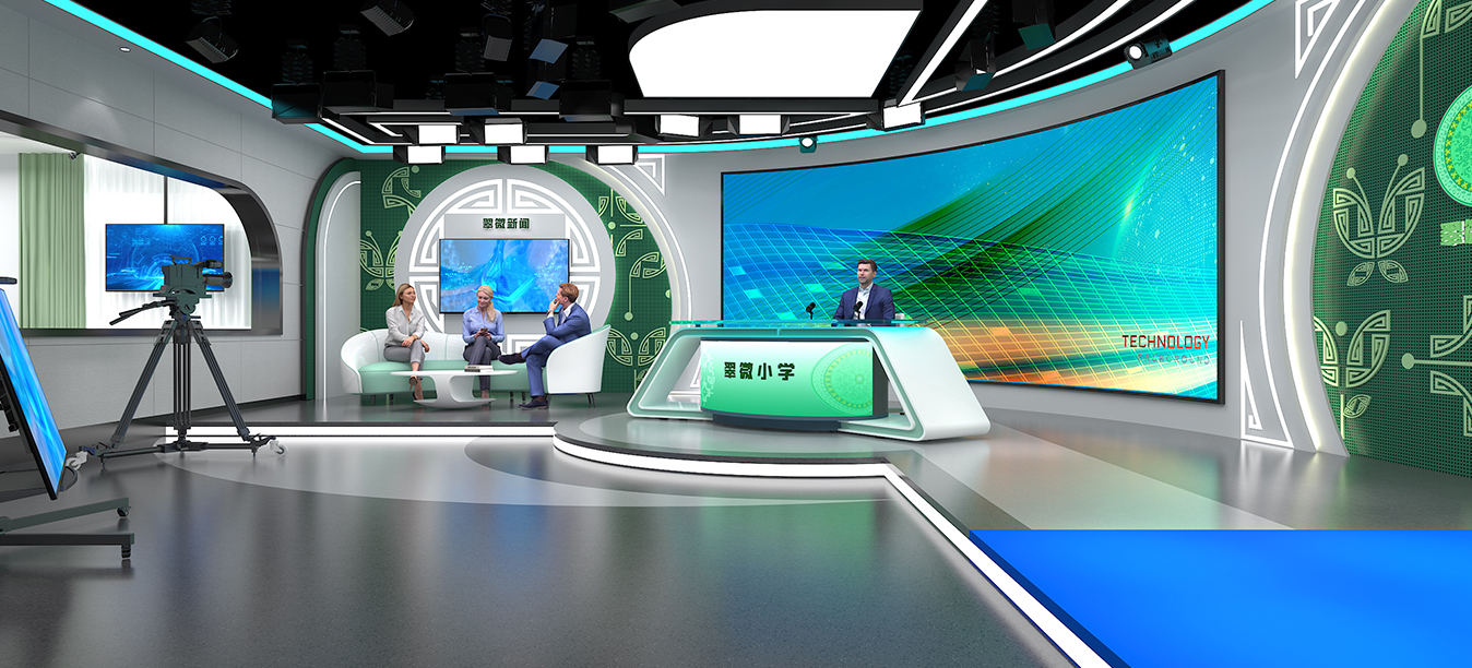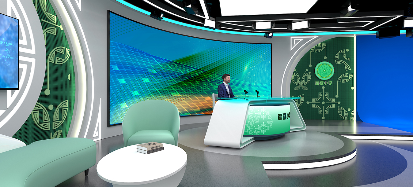 根据要求不知场景环境,部署演播桌椅、高清摄像机、桌面话筒、蓝箱/绿箱,专业灯光搭建、提词器等设备。