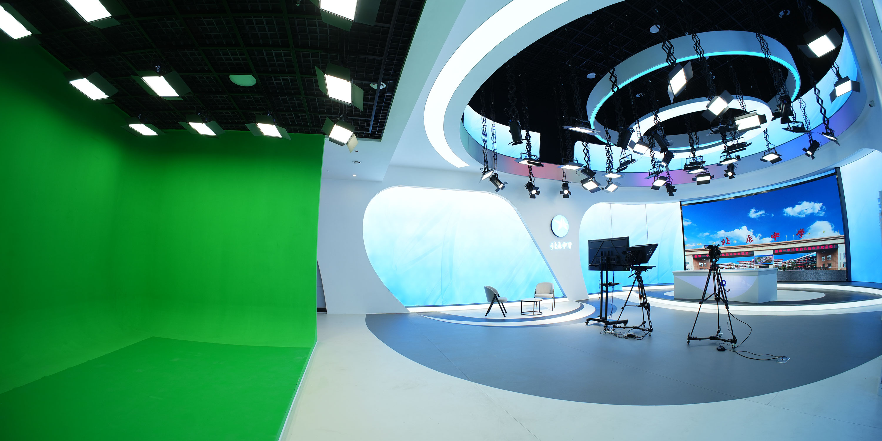 校园电视台由4K虚拟演播室系统、视频采集系统、非线性编辑系统、流媒体系统、现场监看、音频系统、LED灯光系统、蓝箱八大部分组成,是供学校自行拍摄、制作各种电视节目录像,如领导讲话、优秀示范课、教师访谈录、小型文艺节目、新闻节目等,并具有现场直播、录播、转播、转录等多种功能。